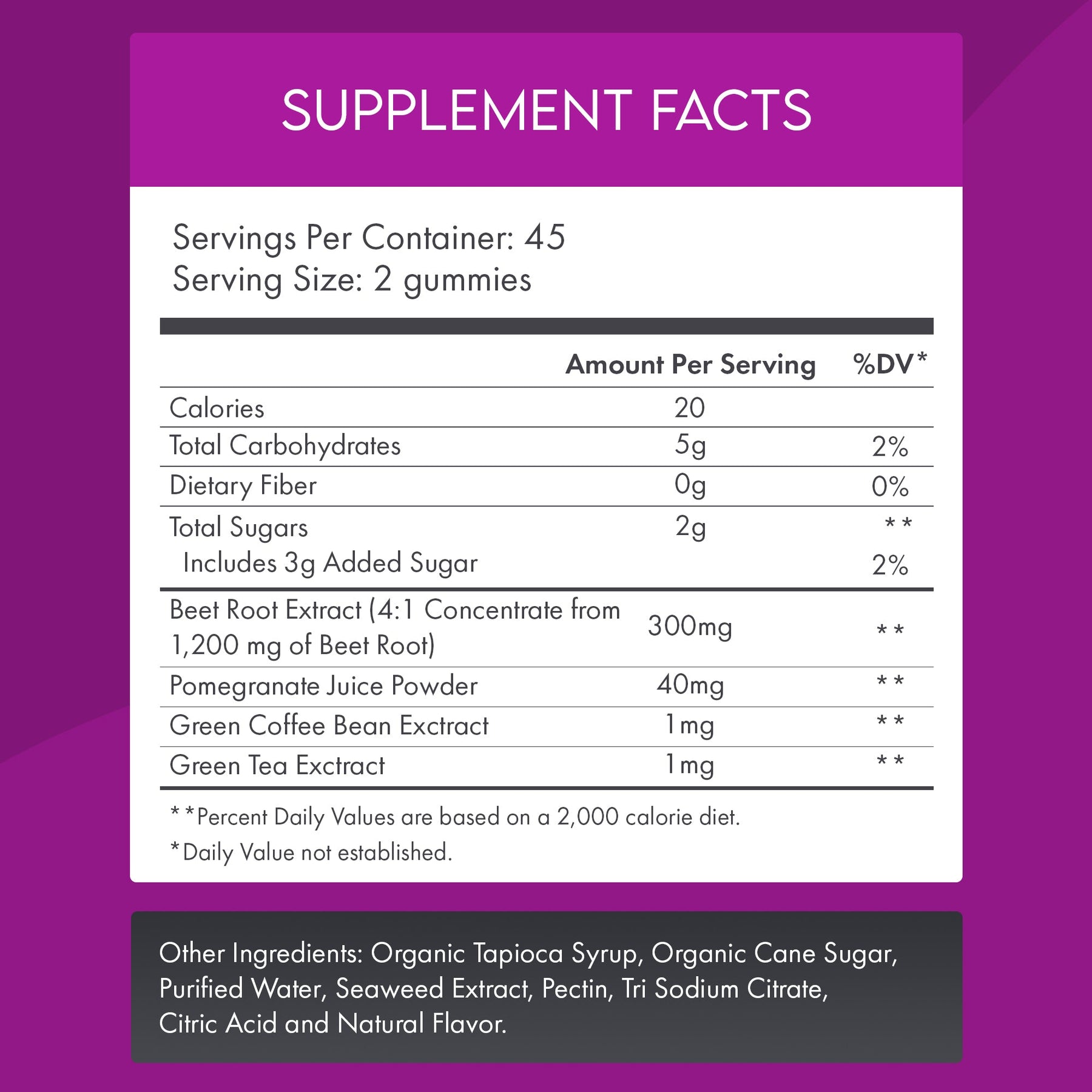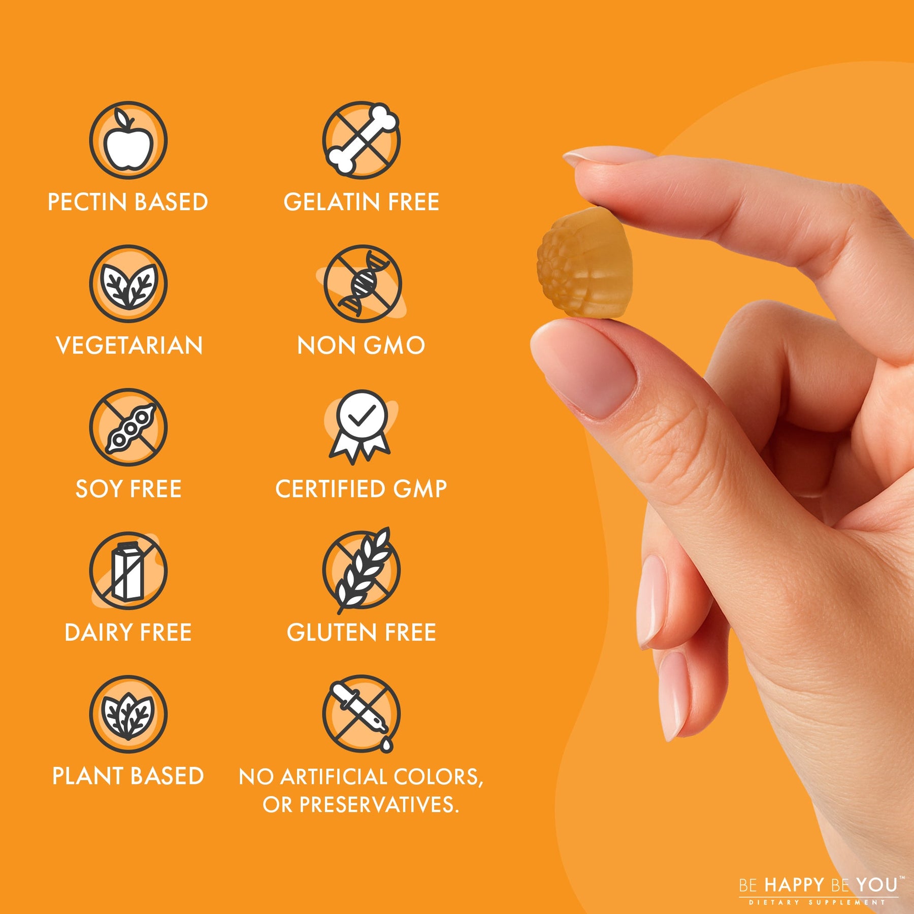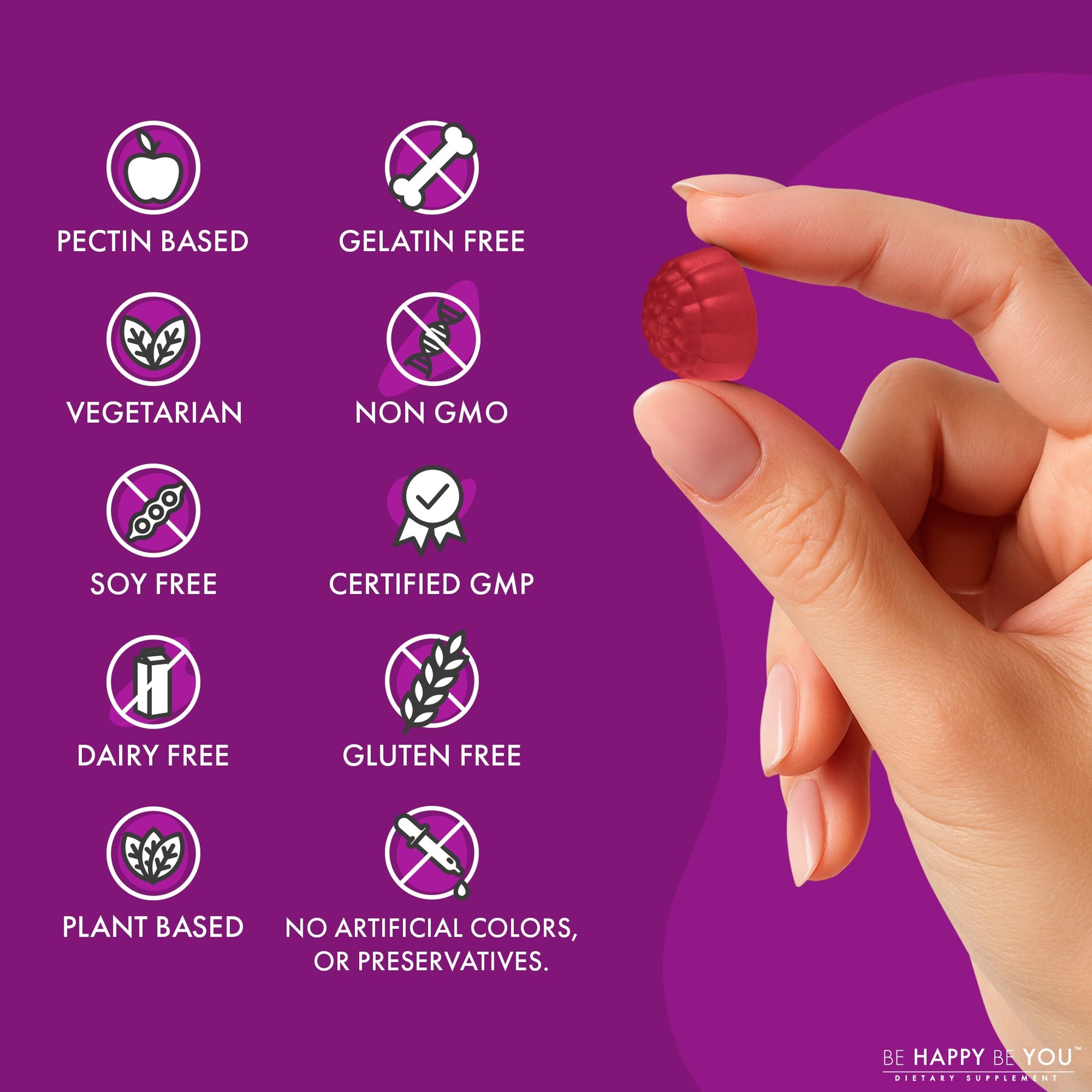 Vegan, non-GMO, gluten-free, gelatin-free, pectin-based gummies. Free from artificial colors, flavors, and preservatives. Just clean, effective fiber.